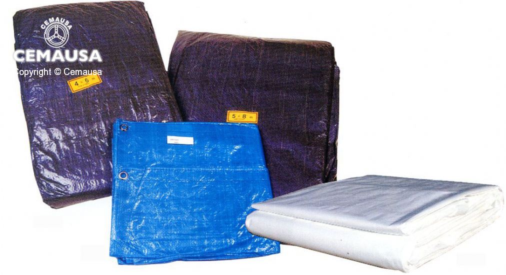 Toldo de polietileno, reforzado e impermeabilizado por las dos caras, resistente al sol, con arandelas de sujección cada metro, costuras unidas por calor y esquinas reforzadas. Color azul y verde ( bi-color).