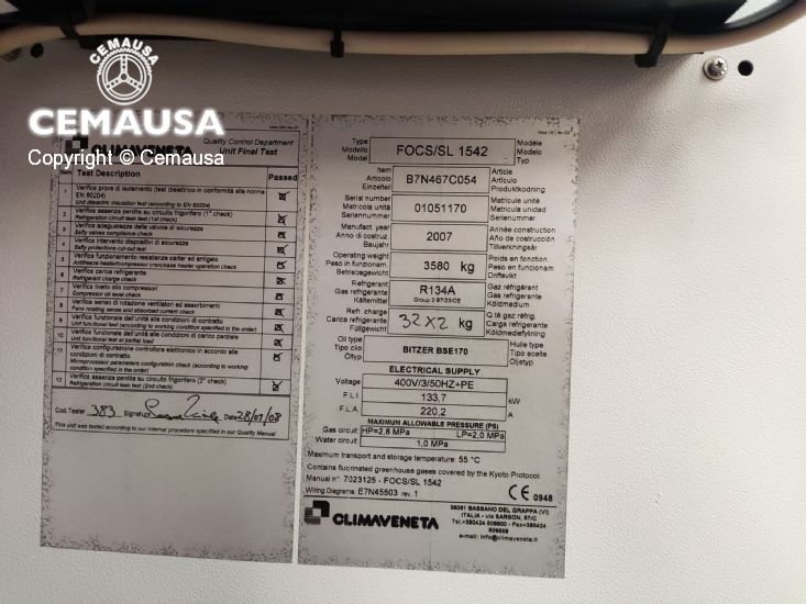Grupo refrigeración agua 250 kw,2167205 frig/h, con garantía 6 meses