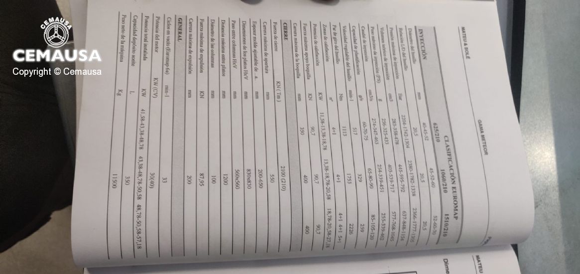 Inyectora termoplástico 210 ton y capacidad de inyección de 595 cm3.